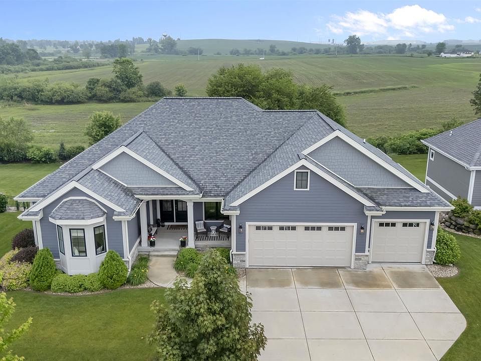This breathtaking custom ranch offers luxury, comfort, and stunning views. Step into a grand foyer with an open staircase, elegant wainscoting, and a stylish powder room. The open-concept great room features a striking coffered ceiling, while the gourmet kitchen boasts high-end appliances and flows seamlessly into a sunroom with a cozy gas fireplace. The serene primary suite includes a spa-like bath with a soaking tub, tiled walk-in shower, and a custom walk-in closet with direct access to the laundry room. The walk-out lower level is perfect for entertaining, complete with a wet bar, two spacious bedrooms, and a full bath?plus room to expand! This exceptional home blends elegance and functionality?don't miss your chance to make it yours!