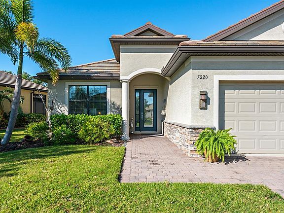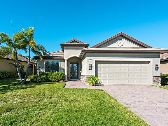 Inside the gated community of Riva Trace, sits this well-appointed 3-bedroom plus den pool home on a premium lot. Greeted by a paver driveway and walkway, you enter into the one-story home through the custom glass front door. An open floor plan provides easy entertaining throughout the main living area and into the backyard. Upgrades galore with a contemporary flair including 12' ceilings, 8' interior doors, 7" baseboards, 20" porcelain tiles on the diagonal, chrome hardware and custom window treatments. The gourmet kitchen features white shaker cabinets; Whirlpool appliances including natural gas stove, microwave, dishwasher and recently replaced GE French door refrigerator; granite countertops with breakfast bar for additional dining space; pantry with custom built-ins; subway tile backsplash; and Murano glass pendant lights. The spacious master suite offers a relaxing retreat with sliding doors out to the lanai, walk-in closet with custom built-ins, and an attached master bathroom with a walk-in shower, dual sinks with espresso cabinetry, and a separate water closet. The two secondary bedrooms have custom closets, and the guest bathroom features dual sinks, linen closet, and a tub/shower combo. At the front of the home sits the office/den with engineered hardwood floors. The laundry room has ample storage space with built-in cabinetry, deep sink, stackable washer and dryer and access to the oversized garage with an upgraded 4ft extension. Enjoy the peaceful ambiance this private backyard provides with lush landscaping and backing up to a natural preserve. The screened lanai is the perfect place to relax and take a dip in the heated saltwater pool with fountain. This home is located steps away from the conservation park with kayak launch and a large deck overlooking the river. The gated, maintenance-free community of Riva Trace has 86 homes, brick paved sidewalks, community-provided yard maintenance and irrigation. No CDD fees. Conveniently located within minutes to UTC Mall, Benderson Park, shopping, dining, I-75, SRQ Airport, and nearby downtown Sarasota and award-winning beaches.