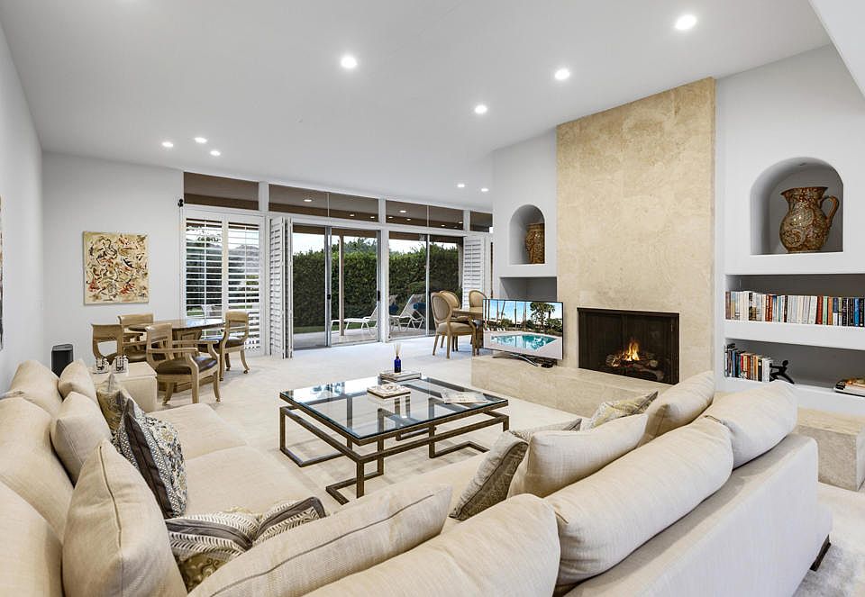 Gorgeous mountain views! 3 bedroom / 3 bath Sandpiper condo @ 2,372 square feet featuring high ceilings throughout, living room fireplace, custom wood shutters and clerestory windows in the living room along with stunning western views of mountains, greenbelt and pool area. Kitchen features black granite counters and backsplashes, and stainless appliances. Unit has 2 master bedroom en suites, and a guest room with shared bathroom all with walk-in showers. Living room opens to both your private and poolside patios offering ample light from both ends. The highlight of the unit is the stunning views thru the wall of living and dining room sliders looking out to your own personal mountain backdrop view from above the pool and greenspace area. Private patio is fully tiled and offers a spacious entertaining area for a barbecue and generous outdoor dining space. A private 2 car garage sits next to unit - a rarity in Sandpiper. This section of Circle 17 is the more exclusive area of Sandpiper with only 8 units around this pool area. Enjoy the good life with the El Paseo dining and shopping, the museum, hiking and grocery stores all within walking distance!