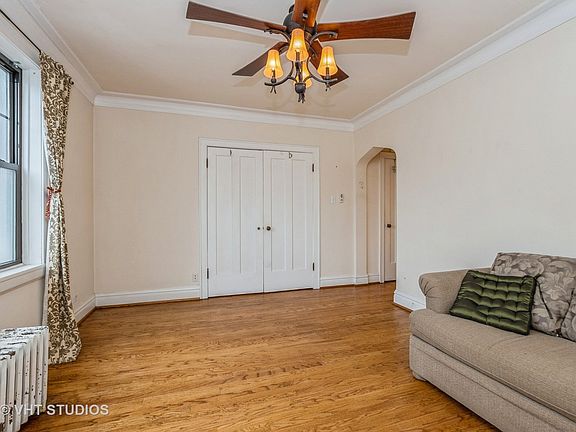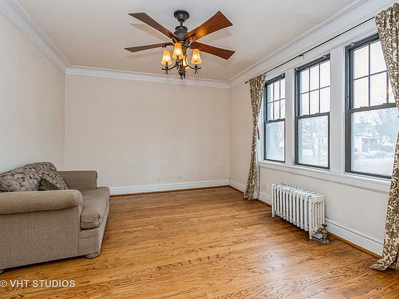 Discover the charm of this vintage condo, ready for your ideas and perfectly situated just steps from all that Downtown Forest Park has to offer! This inviting unit boasts beautiful hardwood floors throughout, classic architectural details like arched doorways and crown molding, and two built-in cabinets that add character and storage to the spacious living room. There's ample space to create a home office near the window, offering a bright and inspiring work area. The eat-in kitchen is well-equipped with a European washer/dryer and a dishwasher for added convenience. Enjoy outdoor relaxation in the common area's fenced yard. Additional perks include a storage locker in the basement and a designated space for bicycles. Located just moments from the vibrant shops, restaurants, and cafes along Madison Street, this condo also offers easy access to Rush Hospital and the Harlem stop on the Blue Line for a seamless commute to downtown Chicago. Village parking options are available nearby. Don't miss this opportunity to own a charming vintage gem in a prime location! NOTE: This is a raised 1st floor (12 steps to the unit.)