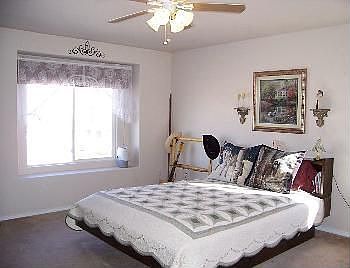 Lovely liv. rm boasts TV Niche,gas frplc w/blowr,stained mantel & arched drwy to the din. area. Open kitch overlooks the rear yrd & has counterbar,GE appliances,lots of counter & cabinets,pantry & storage. Spacious master w/private ba. Xtra lrg tile soaking tub,walkin cedar lined closet & double vanity. Lrg addtl bdrms include desk nook in 3rd bdrm,windw seats & mirrored closets. Large % of yard is xeriscaped w/6 FT. privacy fence. Great neighborhood. Close to schools,shopping,AFB