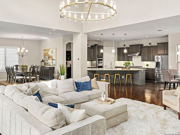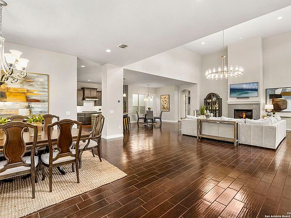 SHOWINGS START SAT 30TH. This charming single-story Sitterle home is in a fantastic location in The Bluffs at Dominion. Easy access from the Aue gate and close to IH-10, The Rim, La Cantera and 1604! If ever there was a home perfect for entertaining - it's this one! Wide open floorplan with a GORGEOUS, oversized center light fixture in the uber-generous main living area just says WOW! The kitchen, breakfast and dining are all located around this wonderful 12 foot entertaining space and an atrium and raised, covered patio are featured on both sides to allow maximum natural light. The kitchen has miles of beautiful counter tops, ample cabinets and gas cooking and double ovens. The island can accommodate 4-6 guests and we all know - that's where everyone gathers! The primary suite is spacious and located away from the other bedrooms for max privacy. Enjoy the spa bath and large closet. Two other bedrooms and a bathroom and half bath are on the other side of the home and the 4th bedroom is at the front of the house. There is an office space conveniently located behind the kitchen with a countertop and built-in shelving. Need more office space? The 4th bedroom has double doors and could be a large office, game room or other flex space. Enjoy solid surface flooring (NO CARPET) - tile in the living and wet areas and hand-scraped wood floors in all the bedrooms. Other upgrades include wood shutters and smart home security & automation with 7" touch screen panel - iPhone and Adroid compatible. A roomy side-entry garage also has an EV charger. Enjoy the backyard space with a raised patio perfect for morning coffee or evening cold drinks. Great price for this GEM in The Dominion. Don't forget to stop by the Club to hear about golf, social and Rotary memberships.