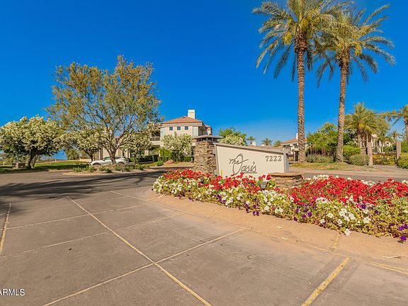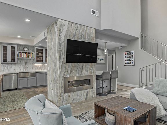 IMMACULATE TOWNHOME in The Oasis at Gainey Ranch. Contemporary 2019 remodel with first floor entry. Dramatic soaring ceilings greet as one enters the open floor plan. Views of pool, cascading waterfall and flowing brook enhance the ambience and tranquility of Oasis living. First floor amenities include dramatic marble fireplace, gas fireplace, breakfast bar, dining area, custom draperies and generous open kitchen complete with KitchenAid appliances and Bosch Cooktop. Bedroom/Den, 3/4 bath and laundry complete the lower level. Master upstairs with stunning quartz bath countertop, walk in closet, custom draperies, balcony and view deck. Additional bedroom with full bath.