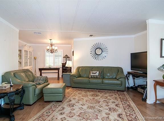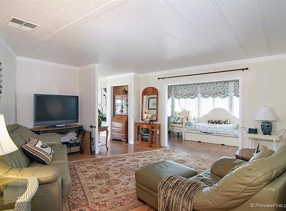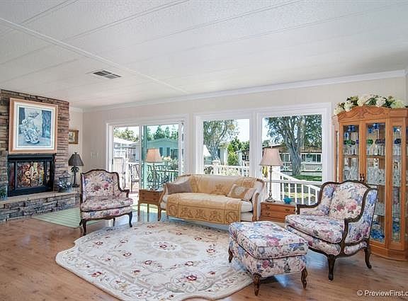 Lake View from newer deck. Enchanting property that has natural sunlight thru out the home. Large Sunroom for relaxing. The lake view is so wonderful. Large windows and living areas. The flooring is beautiful and textured. The kitchen is top of the line and opens to the den that hosts a large brick floor to ceiling fireplace. Crown mouldings in some of the house and new windows. Walk to beach, shopping, pharmacy and restaurants. A million dollar lifestyle awaits. Appx. 1650 land lease. 55+ Mobile Home Community CA BRE# 00596646 CA BRE# 00616663