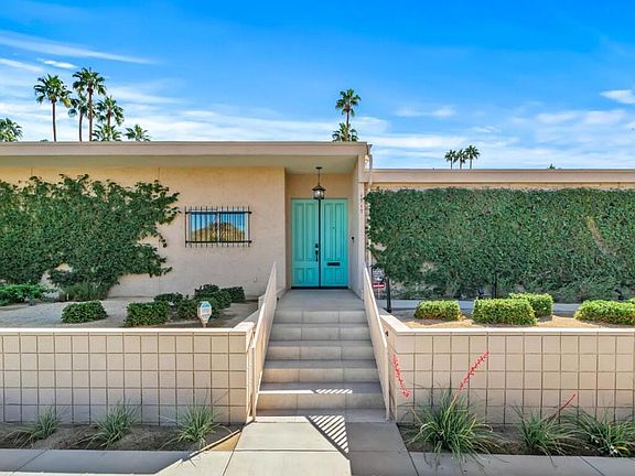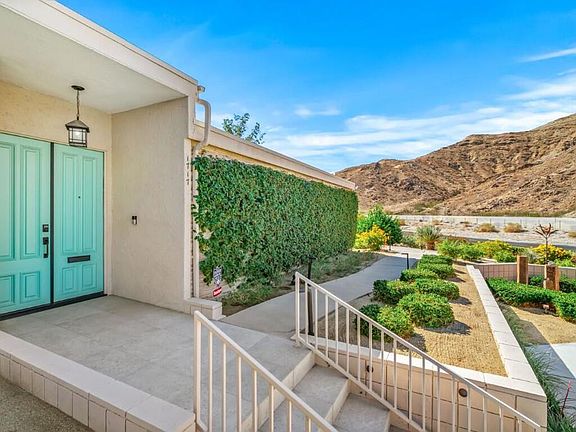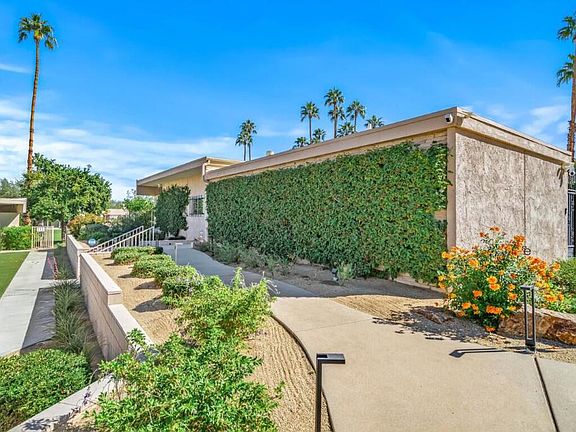 Polished and sophisticated, this 3-bedroom, 3.5-bath Sandpiper residence showcases the best of classic mid-century living, featuring beautifully reimagined spaces and high-end upgrades throughout. This 2,372-square-foot home offers soaring ceilings, dual-pane windows and sliders with remote-controlled roller shades, and a fluid integration of indoor and outdoor spaces--all positioned for maximum sun exposure. The poolside patio overlooks the lush greenbelt and sparkling pool, creating a true resort atmosphere.The fully renovated kitchen is an entertainer's dream, with custom cabinetry, stone countertops, two expansive islands, and custom lighting, including a circular recessed dome with integrated lighting, creating a stunning focal point. Three refrigerators--including a beverage refrigerator and a dedicated wine refrigerator--complement high-end appliances such as a Wolf range and oven and a Fisher & Paykel dishwasher. A built-in desk adds convenience and functionality for work or organization.Two primary suites and a flexible guest suite all include en-suite baths, providing privacy as well as generous closet space. Just off the living room is an additional powder room that is seldom seen in Sandpiper. The main primary bedroom and the living room feature fireplaces-- the living room's fireplace features a striking linear rock design that gently illuminates the seating area. The primary bedroom's fireplace has a traditional mantel of luxurious stone.The living room and two bedrooms surround a private outdoor patio with stellar mountain views. This secluded entertaining space offers a gas fire pit, two overhead heaters, and a retractable motorized awning--all oriented toward sweeping mountain vistas.Additional features include 26 owned solar panels, a wired sound system in the living room and kitchen extending to the primary bedroom suite, a whole-home water filtration system, and a two-car garage adjacent to the unit with epoxy-coated flooring and a 220-volt outlet for EV charging.The outside entry area is extensively landscaped with additional walkways and specially designed touches unique to this corner lot, creating an outdoor entry space unlike any other in Sandpiper.Located in the exclusive Circle 17 enclave--just 10 homes surrounding this intimate pool--this residence blends timeless mid-century design with luxurious modern comforts, minutes from El Paseo shopping and dining, art museums, hiking trails, and everyday conveniences.
