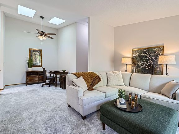 Welcome to this beautifully maintained 2-bedroom, 2-bathroom end unit townhome, ideally positioned to capture natural light from every angle. Vaulted ceilings and skylights enhance the bright, open feel, while the wood-burning fireplace adds warmth and charm to the living space. Step out onto your private deck-perfect for relaxing or entertaining - and enjoy the peace and privacy that only an end unit can offer. The spacious layout offers two comfortable bedrooms with walk-in closets. Additional highlights include an attached 2 car garage and access to a well-managed homeowners association featuring a swimming pool and tennis courts. The HOA maintains all exterior components of the building including windows, door, roof and decks. Home is on the list for a deck update covered by the HOA. This move-in ready home offers the perfect blend of comfort, convenience and community living. Quick close possible.