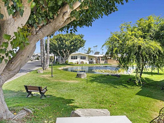Location, Location, Location! Prime Corner Greenbelt & Lake lot!! 2015, 2+bd/2ba, 1575sqft home. Very open, Light & Bright with tall coffer ceilings, recessed lighting, crown molding and views of greenbelt and lake from the covered deck, living room, dining area & kitchen. Speaking of the kitchen, it is complete with center island, dishwasher, microwave & refrigerator. Yard area on single neighbor side with Palm Trees. Yard can be fenced w/Park Approval. Sit on the deck and enjoy the sounds of the fountain and watch the ducks right from the comfort of your own home. Space Rent $2300. NO HOA but tons of Amenities and Activities!!! Lakeshore Gardens is a fun 55+ community with so many activities and ten lakes to walk in nature. Residents love to take their golf carts across the street to shopping and restaurants. Lakeshore Gardens properties are on a land lease $2300.00 a month. No HOA!!