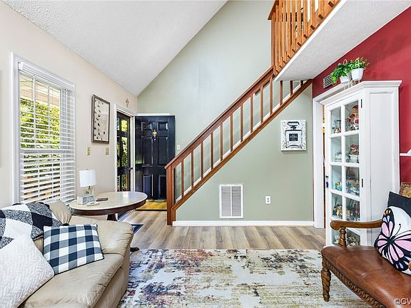 This adorable cape in Deer Run resembles that of Lewis Ginter - very private complete with lush trees, large deck, paver patio, koi pond (two adorable large turtles do not convey), hammock, and all sorts of plants for the gardener or green thumb. The curb appeal of the home starts with the wooded lot, carport, and covered front porch. The home has 2 bedrooms downstairs with 1 bedroom and a loft upstairs. The living room boasts a decorative fireplace with vinyl plank flooring. The kitchen includes black appliances, vinyl plank flooring, and a bay window in the dining area. The downstairs full bath includes stained diagonal wainscotting and cabinets. Both downstairs bedrooms and loft are carpeted. The primary bedroom includes hardwood floors and a large master bath.
