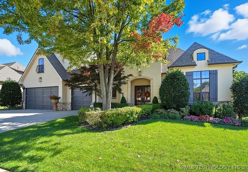 Impressive from the exterior but wow’s on the interior, this Brumble Builders home has been fully remodeled in 2024 & is situated in Woodcreek Reserve. This offers an open layout with vaulted 20' ceilings in the family room, complemented by a gas fireplace & hardwood flooring. The primary suite features hardwood floors & his-&-hers bathrooms with a walk-through shower, soaker tub, & a wrap-around closet providing access from both sides of the bath. An additional bedroom & full bath on the main level are suited for multi-generational living. Formal dining, a office, & laundry facilities are also conveniently located on the first floor. The chef’s kitchen is equipped with stainless steel appliances, granite countertops, a sizeable 5x8 granite island with seating, a kitchenette overlooking the landscaped backyard, dry bar with icemaker, & a spacious walk-in pantry. Upstairs accommodates two bedrooms with walk-in closets & a shared bath. The home theater, featuring a 100" screen, 6 leather recliners, & popcorn machine, provides a relaxing retreat; adjacent is a large bonus room with hardwood floors, ideal for recreation or entertainment. Additional storage is available via two large walk-out attics. Outdoor amenities include a covered deck off the living room—complete with fireplace, gas grill, TV, & ceiling fans—as well as a separate patio suitable for grilling or your smoker. The lot is landscaped & maintained with a programmable automated irrigation system accessible remotely via mobile device. A three-car garage with epoxy flooring & built-in storage adds further convenience. Residents enjoy access to a heated community pool, clubhouse, playground, & fishing pond. The home is located within the award-winning Bixby School District. Renovations in 2024 encompassed new ¾” hardwood floors, carpet, lighting, paint, updated outlets & switches, vanities, & bathtub in the primary suite. New roof installed in 2023, with a transferable warranty.