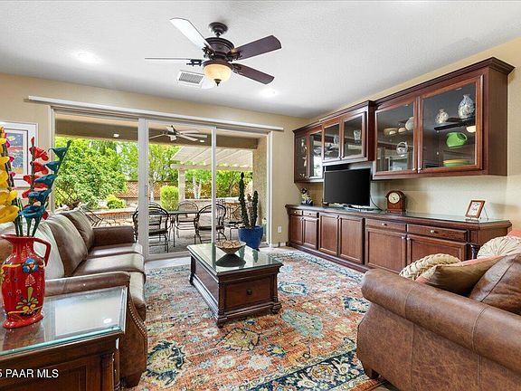 Tucked into the rolling hills of the prestigious Stoneridge golf community in Prescott Valley, this home offers the perfect blend of refined elegance and everyday comfort. With its attractive curb appeal, the home sits adjacent to a natural wash and HOA-maintained open space, giving it a sense of privacy and spaciousness rarely found in the neighborhood. The exterior is warm and inviting, with tasteful landscaping and a well-maintained facade. Step inside to a bright, open-concept layout that begins with a generous great room area. Rich-wood built-in cabinetry provides style and functionality, while dual sliding glass doors extend your living space to the outdoors. The kitchen is a chef's delight complete with stainless steel appliances, abundant cabinetry and a large central island.