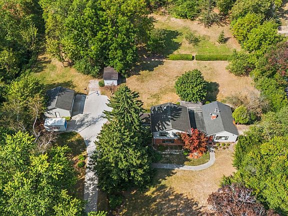 Experience a personal nature preserve in your own backyard with all the conveniences of city living. This homestead, sets on 4.91 acres, is a true wildlife oasis where deer, fox, and a variety of birds are regular visitors. A creek runs along the southern boundary, and walking trails invite you to explore the natural surroundings. This 3-bedroom, 2.5-bathroom home includes an office that could serve as a fourth bedroom, a basement, two outbuildings, and a carport. The sprawling property is beautifully landscaped, with an inviting living room featuring high ceiling beams, a brick fireplace, and large windows that fill the space with natural light. The office, located on the main level, has an attached half bath for convenience, secret storage, abundance of natural light and wood floors. A large formal dining room, kitchen, and breakfast nook take full advantage of the stunning seasonal landscapes. The kitchen boasts custom cabinetry with pull out pantry, tile flooring, ample counter space, and desk area. The spacious primary bedroom is also located on the main level and offers an oversized walk-in closet, double vanity, and shower. Up the winding staircase, you will find two additional bedrooms, one large enough to split into two rooms if more space is needed. The full bathroom on the upper level includes a double vanity with separate areas for added convenience. Recent updates include a newer furnace and AC with 2-zone heating for energy efficiency. All appliances will remain with the home, though they are not warrantied. Laundry is on the main level. The basement is open, giving you the opportunity to create your own space as a Great Room, Rec Room, Craft space, Workshop, or Personal Gym. The concrete patio with pergola allows you to enjoy the backyard nearly all year. This unique property offers the perfect blend of nature, privacy, and modern comfort