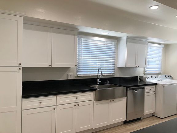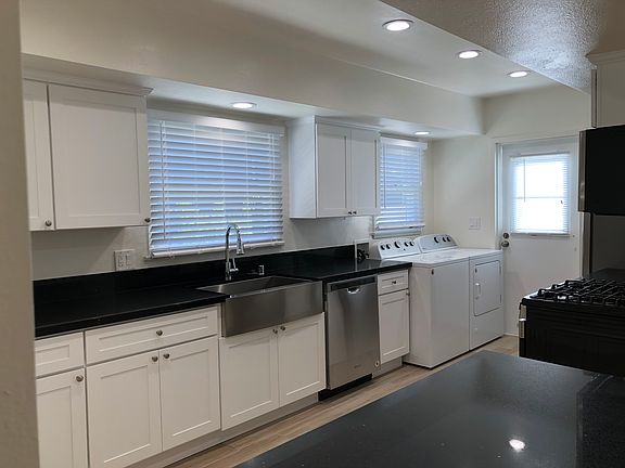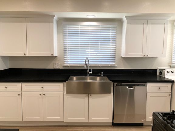 The home features fresh interior paint and a remodeled kitchen with state-of-the-art stainless steel appliances (stove, oven, microwave, dishwasher, and refrigerator). The kitchen also boasts newer cabinetry, a large stainless farmhouse sink, stunning 'Starry Night' granite countertops with matching backsplash, and a breakfast bar with recessed LED lighting.