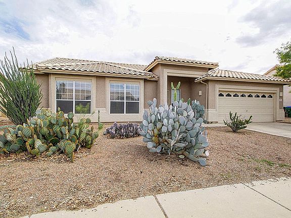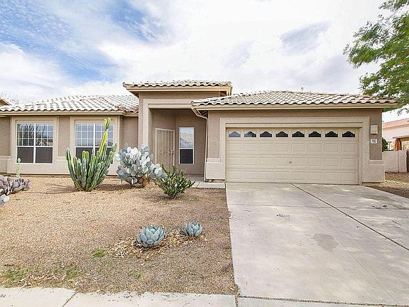 Charming contemporary with 3 bedrooms... Special features include: tile floors, granite counters, bathrooms upgraded with tile surrounds and updated vanities, walk in shower (master bath), split bdr plan, ceiling fans, arched doorways, plant shelves, French doors in the kitchen, covered patio extended with pavers, retention wall with citrus trees, premium synthetic grass, & backyard shed on concrete slab! Situated 1 block from community pool and near parks, tennis courts, schools, skate park, river walk, bike loop, shopping, restaurants, movie theatre, library, dog parks, Premium Outlet Mall and easy access to I-10!