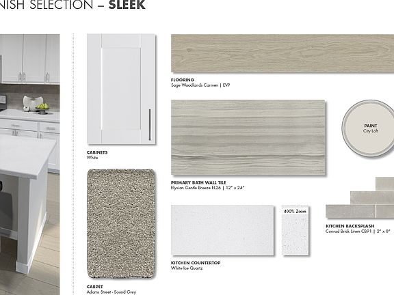 An open-concept layout means you can fix dinner at the kitchen island without missing the conversation in the great room. White cabinets with white quartz countertops, oak EVP flooring and multi-tone tweed carpet come in our Sleek package.