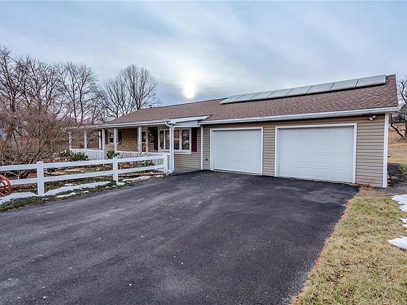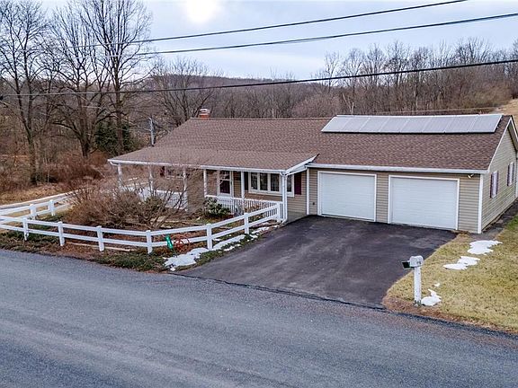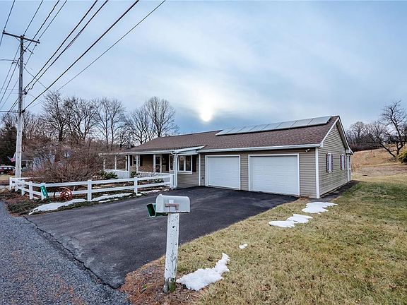 Charming affordable Ranch home! This cozy home features 2 bedrooms and 1 full bathroom, nice sized eat in kitchen and large living room with bright bay window. Enclosed 3 season rear porch is a great bonus that invites you to sit and soak up the sunshine while taking in the beautiful mountain views. Lower level basement has great potential for additional living space and an abundance of storage. NEW ROOF, wood burning stove and solar panels are an added benefit and make this home super efficient! Attached 2 car oversized garage with workspace and additional macadam driveway parking. Outdoors offer beautiful front covered porch, rear patio and utility shed. Call today for your private showing!