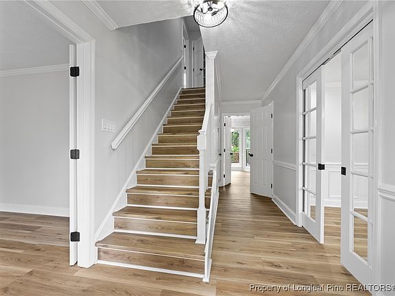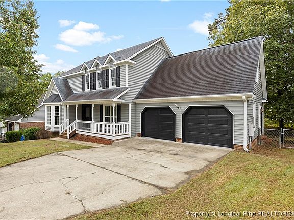 Welcome to this beautiful home with a large front porch and eye-catching details throughout. Inside, LVP flooring flows through all social areas, starting with a wide foyer. To the right, elegant pocket French doors open to a formal dining room featuring chair rail, modern wainscoting, an accent wall, and tray ceilings. To the left, a bright flex room with bay windows can serve as an office, formal living room, or playroom. The spacious kitchen is a dream, complete with quartz countertops, stainless steel appliances, stylish backsplash, extended breakfast bar, contemporary ceiling fan, and a pantry. The adjoining eat-in area includes a built-in desk, plenty of cabinets, and a modern chandelier. The living room offers warmth and character with a real fireplace, built-in bookcases, and a sleek ceiling fan. Wide French doors open to a massive deck, perfect for entertaining, overlooking the fully fenced backyard. Upstairs, the primary suite boasts a large walk-in closet and a luxurious bathroom with dual vanities, quartz countertops, and updated fixtures. All 4 bedrooms are spacious with new carpet and modern ceiling fans. Located just minutes from Fort Bragg, shopping, and restaurants, this home is the perfect combination of comfort, style, and convenience!