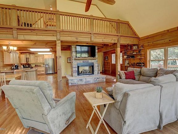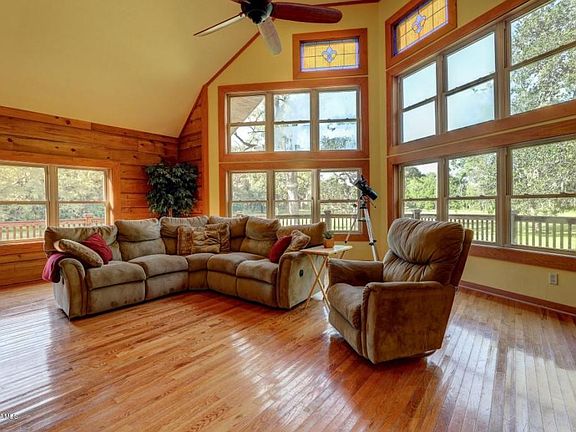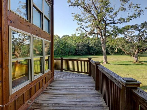 Log cabin home nestled under 200 year old mossy oaks on a near 7 acres! The home is a solid Hideaway Lodge built to last with 1 1/2 stories, 2 bedrooms, 2 baths, separate loft, open floor plan and move-in ready. The floor to ceiling windows make for a picturesque setting as you feel as though you live in the native trees! There is a two sided wood burning Stone Fireplace which is the focal point of the great room with vaulted and beamed ceiling, views from every room of the magnificent grounds, live oaks, pond and greenery. There is balcony decking around most of the home as you enjoy the ultimate privacy in a serine southern setting and a separate decked area for BBQs and family gatherings. The kitchen has hickory custom cabinets, a nice pantry and solid quartzite countertops.
