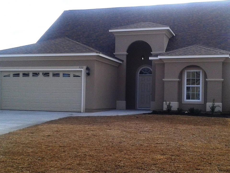Open floor plan with over-sized kitchen & breakfast nook area, and expansive great room/dining room. Master suite located on first floor, with ample sized guest rooms located on the second floor allowing plenty of privacy for you and guests/family. Everything you want . . . granite counter top breakfast bar, under mount sink with high arch faucet, stainless steel appliances, hardwood in living areas, carpet in bed rooms and tile in the baths, nook and kitchen.Ceiling fans in the Great Room and Master suite. 2 Car garage with opener, sprinkler system installed with full sodded yard, security system for interior. Crown molding and trim throughout main living areas. Available for immediate occupancy.