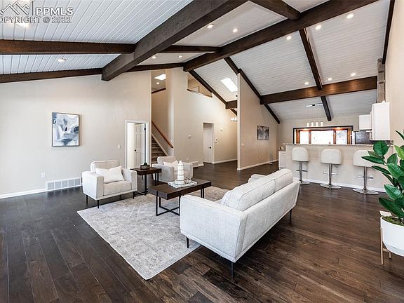 BEAUTIFULLY REMODELED 4Bdr/3Ba townhome in Broadmoor Heights! This stunning home is nestled up against Cheyenne Mountain in the securely private gated community of Count Portales. As you enter the front door, you will immediately feel the elegance of the home with vaulted ceilings, rustic beams and custom finish work throughout. The great room features a custom stone fireplace, an inviting open-floor concept and amazing mountain views. The gourmet kitchen is every cook's dream with granite countertops, expansive island for entertaining, state-of-the art appliances and soft-close cabinetry. The main floor primary suite boasts an oversized walk-in closet, oversized windows and a spa-like bathroom complete with his and her vanity areas, vessel sinks and custom tile work extending along the walls and around the soaking tub. The walk-in-shower is tastefully appointed and features high-end fixtures, custom tile work and rain shower. On the upper level of the home you will find an open loft with skylight and vaulted ceiling, great for an office space or an additional entertainment area. The two bedrooms share a relaxing full bath with custom tile work, shower and extra-large linen closet. The basement provides even more space with bright lighting, luxury bathroom, plush carpets in the large open room that could be used for the addition of a theater room, bonus family room or entertainment area. The 4th bedroom could make a quiet guest room. A home humidifier keeps you feeling healthy in the naturally dry climate of Colorado. Other features include new windows, AC, radon system, new roof installed December 2022, tons of storage space, new on-demand hot water heater and quiet-close garage door. You will enjoy the beautiful views and Colorado days and nights from the back patio. This property is both secure as well as low-maintenance and ready for its new owners!