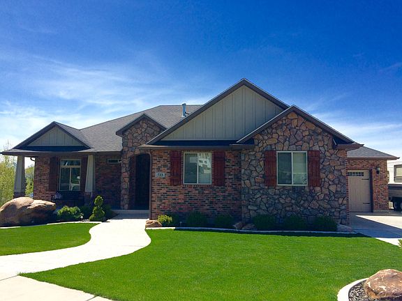 Solid brick & rock home in quiet neighborhood with amazing views of the mountains. Granite countertops with knotty alder cabinets,hardwood floors, stainless steel appliances, Surround sound, Large 3-car garage, fully landscaped yard with sprinkling system, 9ft ceilings in basement with walkout basement, fenced in yard, RV pad.