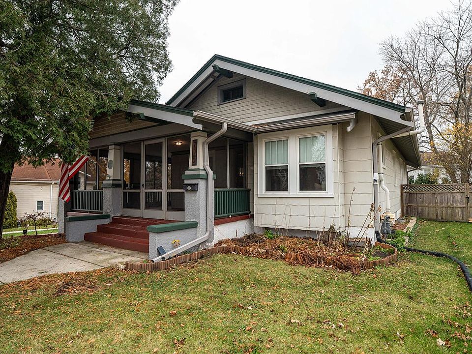 Step into this charming 3-bedroom, 1.5-bath ranch home, full of character. Natural light pours through the large windows, highlighting the crown molding, stained-glass & hardwood floors throughout. Thoughtful layout connects the living room, dining area & kitchen, creating a welcoming flow. 3 bedrooms & updated full bath complete the main level. Finished basement provides additional living space, perfect for a rec room, play area, or home gym, with a convenient half bath. Outdoors, enjoy the spacious screened-in wraparound front porch & private, fenced-in backyard featuring patio, storage shed, & raised garden beds. Several updates have been thoughtfully made. Perfectly situated near schools & parks, including Buchner Park with its many activities, this home is ready for you to move in!