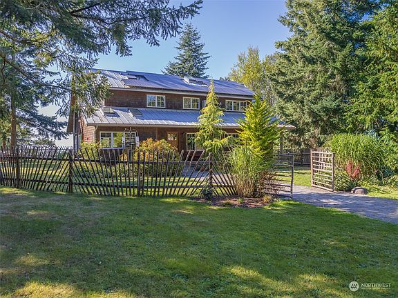 Nestled on shy five acres of pristine coastal estate, this custom-built waterfront home offers architectural elegance, natural beauty and eco-friendly living. With scenic views of the straits, sunsets, and Protection Island, this intriguing home features old-growth interior fir wood trim and beams, vaulted ceilings, solar panels, luxury appliances and radiant floor heat. Enjoy views from every room, including four private bedrooms and two luxurious baths. The spacious gourmet kitchen is a chef’s dream. Private and quiet, this rare property includes an orchard, goat pen, flower gardens, room for an ADU & animals. Embrace the tranquility of this unique waterfront retreat just 15 minutes from historic Port Townsend. Short-term rentals allowed.