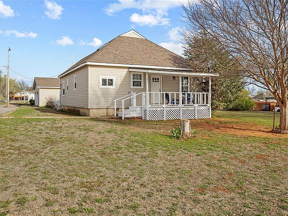 Absolutely charming bungalow located on a large corner lot in Thomas, OK. just 20 minutes North of Weatherford, OK. Updated throughout with fresh texture & paint, new stainless appliances including gas range, easy care for LVP flooring, along with recent windows, 2" blinds, fixtures and ceiling fans. Large open floor plan with Living / Dining combo for great entertaining space. Wide base moldings and casings add to the character of this immaculate home. Owner's suite with bath is located on the main floor & features a private mini split to regulate the temp in this area as you wish in addition to the central heat & air that serves the entire home. 2nd bath for guest and private laundry room off the Kitchen plus a bonus mudroom space on back could be home office / study. Two additional bedrooms upstairs give the kids or guest privacy. BONUS: Whole house Generac generator allows for uninterrupted power, plus for additional peace of mind and safety with an in-ground storm shelter accessed from the covered patio. OVERSIZED detached 2 car garage / shop area is approx. 600 sq. ft. of space. Wonderful outdoor space is covered and fenced with many specimen trees and flowering shrubs on the property. Plenty of parking on the circle drive. Easy walking distance to schools & activities. Put this one on your short list to see!