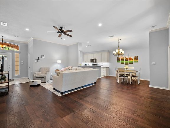 Beautifully maintained 3-bedroom, 2-bath home featuring an oversized living area with crown molding and a cozy gas-log fireplace, seamlessly open to the dining room and kitchen—perfect for entertaining. The versatile third bedroom can serve as a private home office. The spacious primary suite offers a double-sink vanity, separate shower, and a large walk-in closet with built-in shelving.