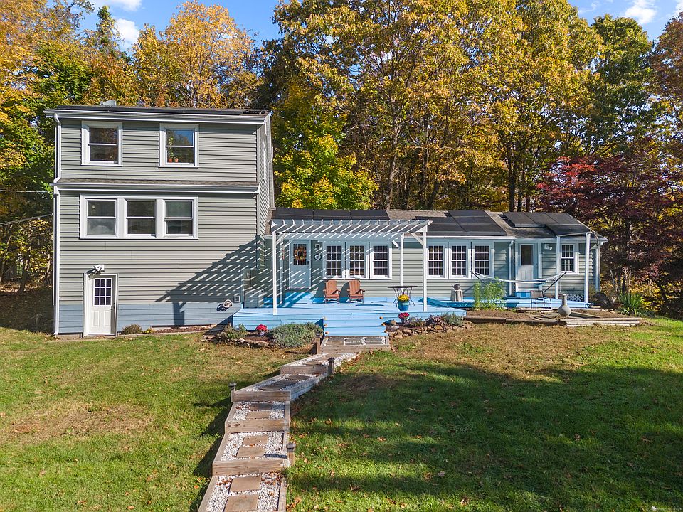 A private shared driveway leads you to this Charming home situated on a slightly wooded .84-acre lot creating peaceful privacy. The 1469 sq foot Cape with 2/3 Bedrooms and 2 Full Baths is located in picturesque North Guilford. Stone pathway leads you to the property where you are greeted by a clean, bright newly stained deck with pergola and plenty of space for outdoor entertaining. The home features a spacious kitchen freshly painted, stainless steel appliances, large island and eat in area along with a pellet stove making cozy warm winters. Three Brand NEW windows installed in kitchen allowing for an abundance of sunshine. A large sunlit Living room with three additional Brand NEW windows installed along with classic French doors leading to backyard. A den/office space leads to the 3rd bedroom on main floor. Up a few stairs you will find the Primary bedroom with adjoining full bath. On upper floor a very spacious bedroom is located with ample closets. Detached two car Garage/Barn includes loft and workshop with freshly painted doors. Shed for additional storage. Sunrun Solar Panels leased a plus. Don't miss this opportunity! Town has this property with 3 Bedrooms which is a plus but currently used as a 2 Bedroom home. Seller pays $115/month for solar and $9.62/month for Electric. He has approximately 3000 kwh banked to date. Brand New windows are in the garage waiting to be installed.