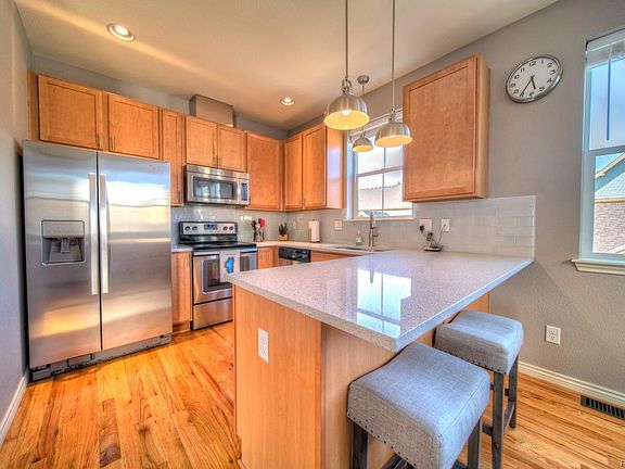Lovingly maintained & beautifully updated townhome w/ two-tiered patio & trex deck. Tiled entry & full sized lndry. Sustainable bettle kill Pine tongue & groove accent wall in the living & dining rm. ½ bath w/ pedestal sink & custom penny tile wall. Stainless appl. & quartz countertops. Updated lighting & fixtures throughout. Covered trex deck w/ views out to the park & common area. Mstr. w/ ceiling fan, walk-in clst & full bth w/ quartz countertop. Spare bdrm w/ ceiling fan & full bth w/ quartz countertop. Finished garage & just steps to the community park & playground. Two blocks to the Coal Creek Trail & just minutes into town, shopping, grocery, restaurants & more. SEE STREAMING VIDEO!