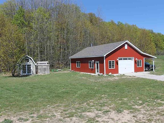 Gorgeous countryside setting on 11.24 acres with a quality builder's home, custom built in 2011, just 5 minutes to Munson! The ultimate in privacy, the driveway winds into the woods and around a private pond before opening to this lovely home with a matching pole barn. You'll enjoy both privacy and panoramic vistas for miles, all the way to Empire. A wrap-around covered porch welcomes you home to sit and relax. The slate-tiled foyer opens to the living room, complete with a fireplace, 3/4" hickory floors and an illuminated tray ceiling. Abundant natural light flows in through large windows and the sliding door off the dining room that leads to the deck. Next you'll find the kitchen with brilliant white cabinets and subway tile back-splash, granite counters, stainless appliances, a farmhouse sink, walk-in pantry and family command center nook. The mudroom off the garage has open lockers to keep everyone organized. Upstairs you'll find a charming window bench flanked by bookcases on the landing, the master suite with a private bath, office and walk-in closet, two more bedrooms, the laundry room, and a full bath with a skylight. The walkout level is almost finished and will have an L-shaped family room with a beadboard ceiling and fireplace, a play room with a kitchenette, a full bath with white hexagonal tile, and an additional non-conforming room, ideal for a craft space or workshop. The walkout patio hosts a hot tub for unwinding. Additional highlights include a geothermal heat system with a propane back-up, Pella windows and sliding doors, a ventilation system, constant pressure well and more. The 30x40 pole barn is finished, heated, insulated and has a 10' lean-to. Gather fresh eggs from chickens in your own chicken coop. The rolling countryside property features 200 black walnut trees which could potentially have a 7-figure value at maturity, and it borders a picturesque horse pasture to the west. The pond is home to a mallard and wood duck family.