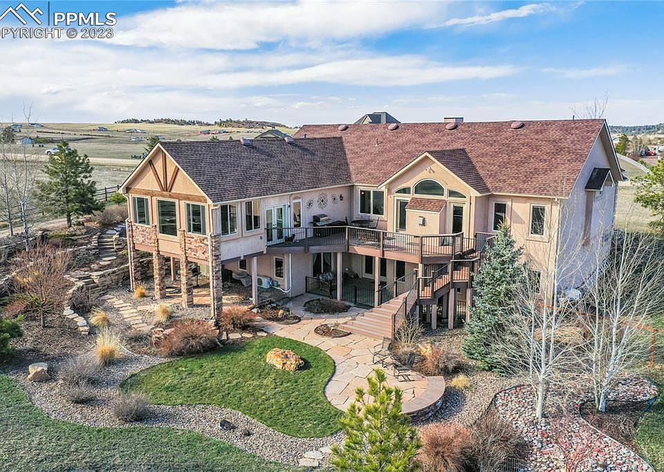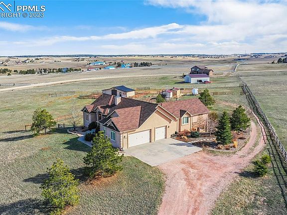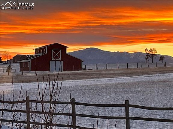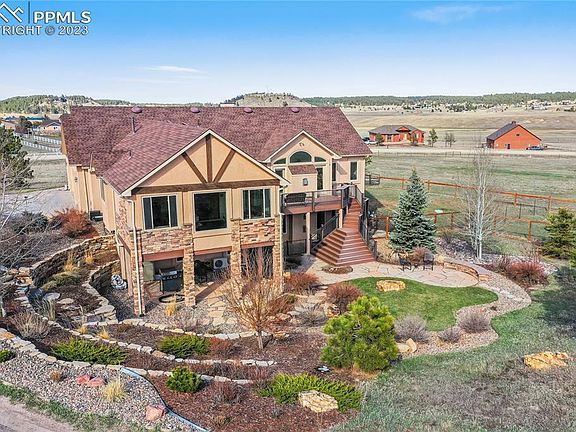 Unbeatable location in northern Black Forest with a custom ranch floorplan that has everything you have been searching for, starting w/ main level living w/ over 3,800 sq ft, 5 serene acres in an equestrian friendly community w/ a barn, a detached workshop area and jaw dropping outdoor entertaining space. Quiet cul-de-sac location positions the home perfectly for stunning views of Pikes Peak and the surrounding treed hills. Resort like oasis backyard w/ a beautifully designed composite and metal deck, stacked stone retaining walls, large boulders, flagstone patio, covered patio, lush green grasses w/ mature trees, walking paths, rock gardens, bushes and flowers. Two stall 24x48 barn w/ electric, water, automatic heated waterer, tack room, hay storage and 2 large overhead door making tractor storage simple. Separate 2 stall loafing shed. 10x15 hobby workshop w/ sink, electric and a wood burning stove. The impressive main level primary suite w/ walk-in closet, large jetted tub, separate shower, planation shutters double vanity and a 374 sq ft sitting room w/ fireplace, wall to wall windows, air conditioning, tile floors, stone surround, vaulted ceilings and walk-out to the deck. Main level laundry. The great room walks out to the large entertaining deck and features a gas fireplace, a wall of windows, vaulted ceilings, hardwood floors and is open to the kitchen. Upgraded kitchen w/ gas cook-top, stainless appliances, under cabinet lighting, cherry cabinetry, granite counters, pantry and an island w/ seating. Formal dining w/ hardwood floors, in ceiling speakers, large window and coffered ceiling. Two additional main level bedrooms in addition to the primary suite. Fully finished walk-out basement w/ expansive family room w/ fireplace and tons of entertaining space. The lower level has two additional bedrooms and bath. Convenient location making travel to Colorado Springs or Denver fast with great access to HWY 83, I-25, the amenities of Monument. Zoned for horses.