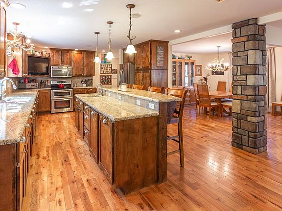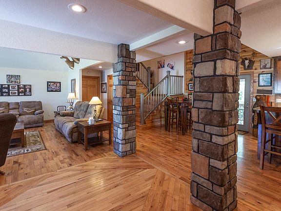 Custom Home w/ Large Shop for Sale in the Ozarks of South Central MO. Estate on 10AC m/l w/ one of a kind home offers an open floor plan, hardwood floors, Kitchen w/ Granite, Stainless Steel Appliances, Living room w/ Cathedral Ceilings, fireplace, 4BD & 5 full baths (including 3 full bed suites). Energy efficient home w/ geo thermal system. Large deck wraps around back of home w/ beautiful views is maintenance free w/ composite decking. Walk-out basement includes wet bar & large entertainment area. There is a total of 4 garage stalls attached to home w/ 2 car garage on main level & 2 car garage on lower level. Shop w/ 7500 Sq Ft of space w/ heat, air, kitchen, full bathroom, projector & screen! Pull through building w/ a semi if you like. Floor drains in place, insulated w/ quality construction. This large shop is perfect space that could house a commercial business w/ enough space for additional living quarters as well. Can be purchased with additional land of 27 acres or 69 acres.
