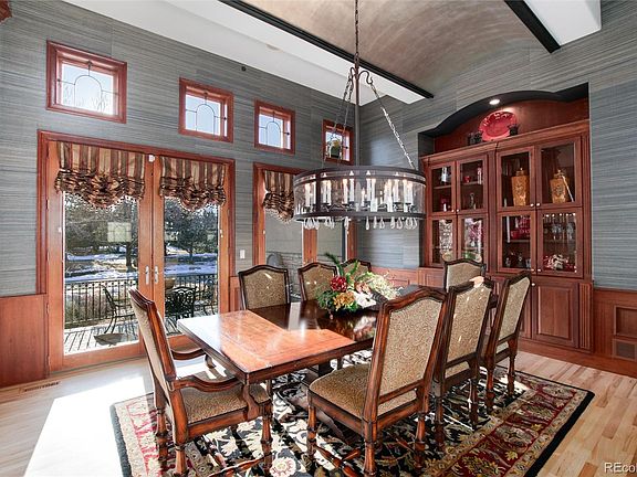 - Description: Dining Room Has Hand Applied Silver Leaf Barrel Vaulted Ceiling And Applied Molding. Natural Horse Hair Wall Application. Two Double Doors Out To Patio With Fountain.