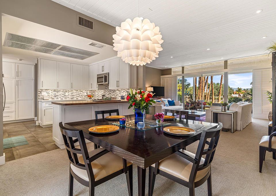 Mid-century chic with stylish contemporary design! Spacious 2 bedroom / 2 bath Sandpiper condo at 1,872 square foot with private patio features a large open floor plan with the living, dining and kitchen areas flowing into one another, and out to the patios - a bright and spacious feeling for easy living and effortless entertaining! Unit has a beautiful mix of flooring, including modern tile, warm laminate, and carpeting, highlighted with mid-century architectural elements of clerestory windows and high ceilings adorned with tongue and groove finish work, punctuated by subtle recessed lighting. Kitchen highlights include quartz and wood countertops, new cabinetry, and stainless steel appliances. Boasting two generously sized bedrooms and two meticulously designed bathrooms, the primary suite offers a dedicated office nook nestled near the closet and bath area and guest bathroom features an alternate entry from either bedroom or from front entry hall. Bathrooms include updated, modern walk-in showers with glass enclosures and spacious closet space. Enjoy the beautiful desert evenings under the stars on your private patio with gorgeous mountain view or lounge in the sun on your poolside patio with your resort like view of the green space and pool area in circle 16 of Sandpiper. Adding to the convenience, this unit includes a garage space situated next to the residence, equipped with a 220V outlet for electric vehicle charging.