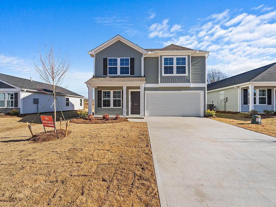 This Guilford floorplan is inviting you to enter as you approach the warm gray exterior. This home greets you with a lovely, rich luxury vinyl flooring that can be seen throughout the first floor. The flex room is a great option for a home office, dining room or a play space for the kids. The kitchen complements the exterior with the gray shaker style cabinetry, granite countertops and stainless steel appliances. At the top of the stairs is a loft that gives additional space for the family to hang out or read a book. The three secondary bedrooms are spacious offering plenty of closet space. The primary will turn into your oasis with the vaulted ceiling, walk in closet and a en-suite that will surprise you! It is showcasing quartz countertops, a five foot shower and plenty of storage. Come out to Regency Walk today and fall in love with this home!