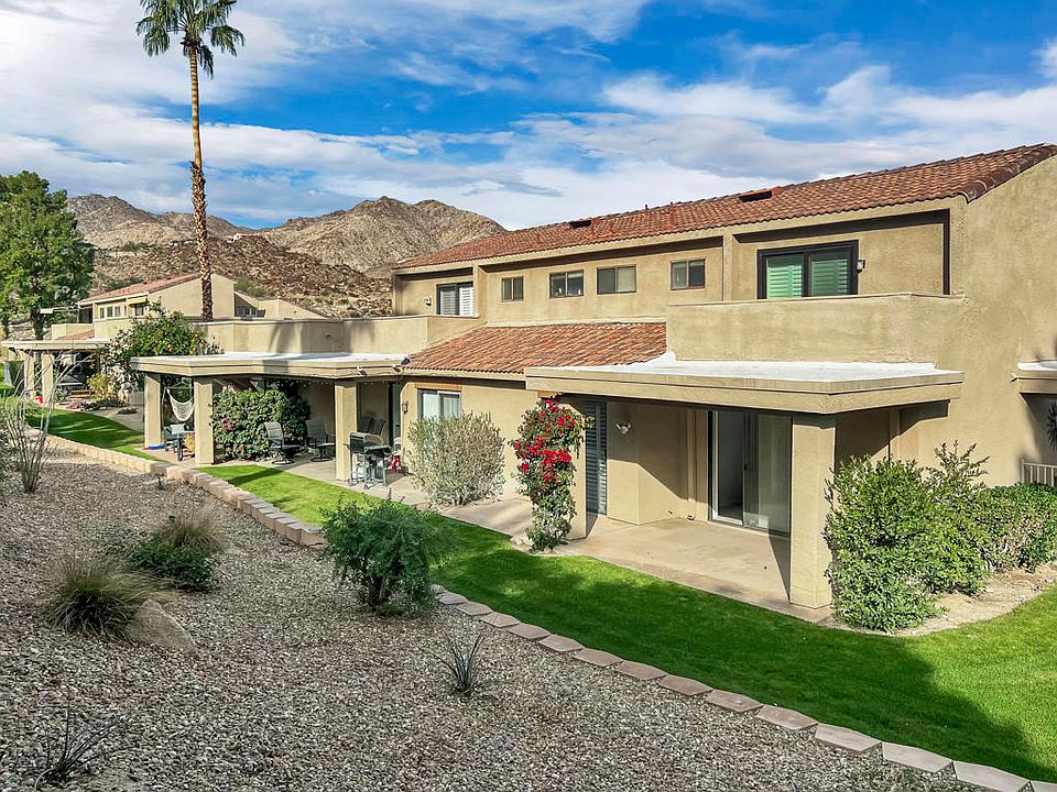 Rare two-story townhome nestled just below the base of the Santa Rosa mountains in the quiet hillside community of Sommerset in popular South Palm Desert. This lovely home is the largest floorplan in the community (1,786 sq. ft) and offers two large bedrooms on the main level, along with the kitchen, great-room, guest bath and laundry. Also on the main level is an enclosed entry patio facing north and an open patio off the great room facing south. The upstairs is dedicated exclusively to the large and very private primary retreat complete with a balcony for enjoying those beautiful mountain views. Recently refreshed with new carpet and paint, the property also boasts plantation shutters throughout, beautiful wood-look floor tile, along with a newer top-of-the-line HVAC system, newer water heater and newer garage door opener. The home also comes with a 1-car garage and 1-car covered carport for an additional vehicle. The community of Sommerset offers 9 community pools, 3 tennis courts plus pickle ball and is just up the hill from world famous El Paseo's first class shopping and dining. Monthly HOA dues of $525 are some of the lowest in the valley. This special home checks off every box and would make a fabulous primary home, a vacation home or investment property. Call today for a private tour before it is gone! Please note: Some photos have been digitally staged.