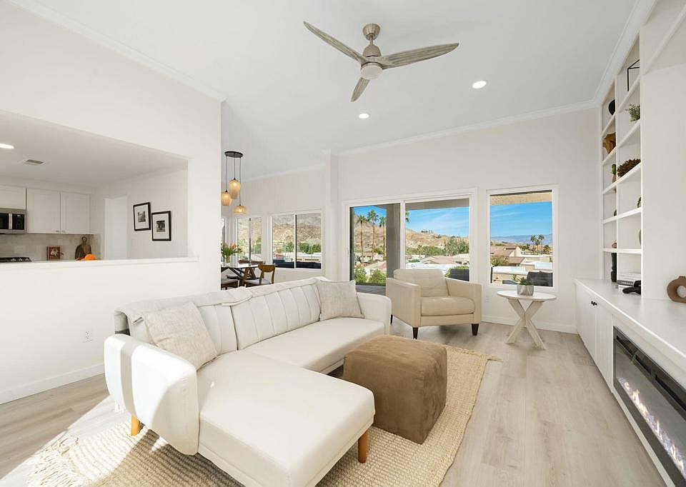 Great opportunity to own a home with a BREATHTAKING Mountain & valley views in the beautiful community of Sommerset Palm Desert. Sophistication in design is shown throughout. High above the valley floor, you'll find this single-level 3 bedrooms, 2 bath 1654 sq. ft. condo just completed upgraded to new, never lived in with multiple smart home devices throughout the home. With tons of upgrades, this condo has lots of space for living and entertaining, in the large living room and separate dining room that overlook lovely mountain and down-valley views. There are 3 bedrooms, including a large primary suite, 2nd bedroom next to the full guest bath, and 3rd bedroom just off the open atrium, that offers lots of natural light within the condo. The kitchen is light and bright with NEW cabinets,NEW appliances and new quartz countertops. Additionally, the home has brand NEW windows, NEW AC unit, NEW premium luxury plank flooring, NEW vanities, NEW exquisite tile design is presented in both bathrooms and kitchen. The back patio overlooks the tennis and pickle-ball courts below and has easy access to the adjacent community pool/spa. Take advantage to create your own special desert property! Sommerset is a special community, with lovely grounds, spectacular mountain views and amazing valley views! Located near hiking trails, entertainment, and El Paseo, with its world class shopping, dining, art galleries.