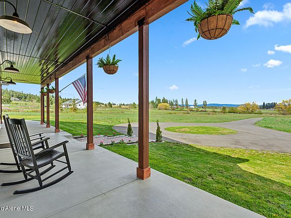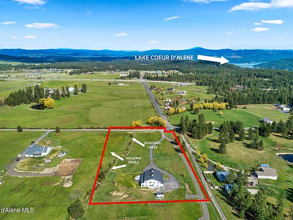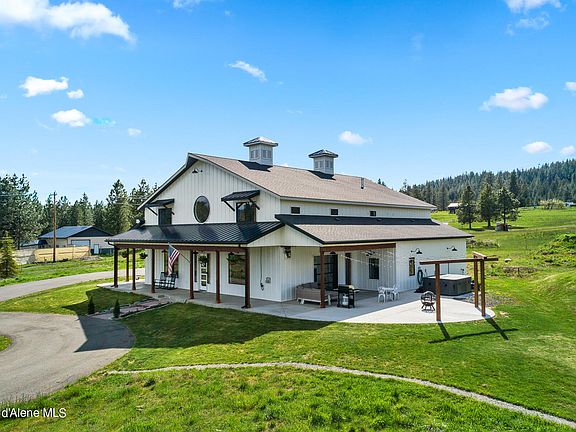 This is the ultimate frame-built barn home with modern flair, high-end amenities, and character throughout! This 5,200+ sq/ft home sits on 5 usable acres with a seasonal creek, walking paths through the hayfield, gorgeous mountain views, and a quick 5-minute drive to the Mica Bay boat launch. The square footage includes 4bd/3ba, a theater room, office, craft room, and loft area in the main home plus a full 1bd/1bath attached guest home with its own separate entrance and garage. Enjoy picturesque sunrises on the wrap-around covered porch or beautiful sets under stringed lights on the patio with a fire roaring. This is truly a one-of-a-kind home and only 10 minutes to downtown Coeur d'Alene! The seller is offering a $15k credit towards closing costs or landscape upgrades!