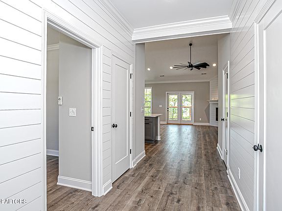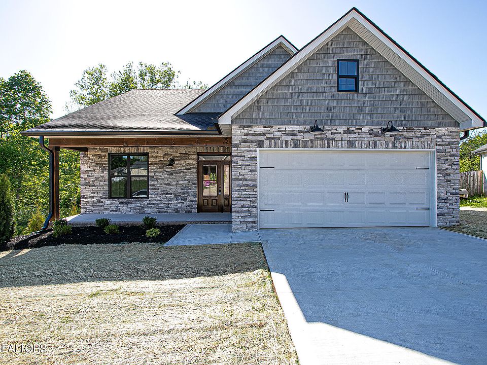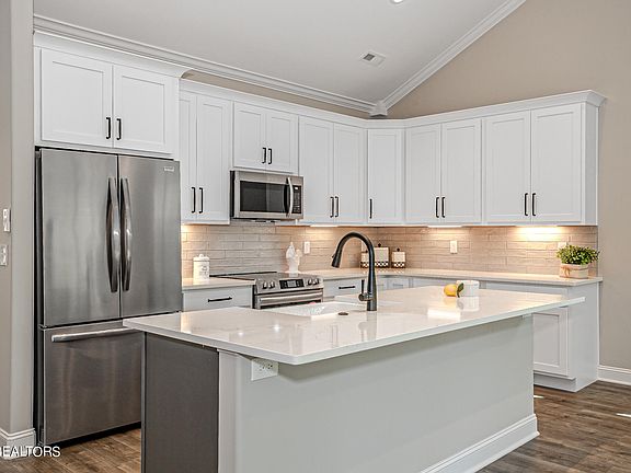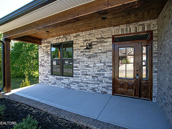 Another Carl Perry Construction beauty! All brick with stone accent home with great curb appeal. The glass front-door allows natural light into a grand foyer with shiplap and crown molding that brings you into the great room with vaulted ceilings which allow a open-concept style for living. Lovely kitchen with soft close cabinets, quartz counter tops, large porcelain farm sink, huge island,. Kitchen is open to dining area that has a transom of craftman style windows to allow natural light, yet allows privacy while enjoying family time around the dining table. Living area has a corner electric-log fireplace and french style doors that lead you to covered back porch with trek flooring, beautiful railing with copper caps, and ceiling is real wood, stained for a rich look. Your view is a nice size backyard and with trees at line border that offers privacy as you enjoy outdoor time on your porch. Master has corwn molding, and master bath had double sinks in vanity, shiplap, walk in tiled shower and closet has custom fixtures. Two other bedrooms share second full bath with tub/shower combo. Laundry room is a nice size . Builder has upgrades galore such as a gas tankless hot-water heater, epoxy floors in garage, SS Appliances and includes Refrigerator and more. This home is adorable, very low maintenance and convenient to Knoxville area.