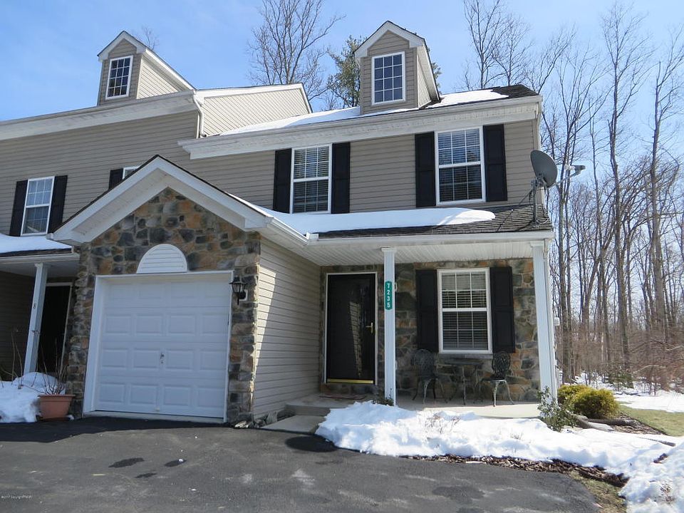 MAINTENANCE FREE LIVING! You will love this barely-used end unit townhome in beautiful Blue Mt. Lake Estates. Attractive open floor plan with large living area w/gas fireplace, separate dining room and convenient kitchen area with center island and stainless appliances. 2nd floor has large master bedroom w/bath ensuite, 2 good sized additional bedrooms and main bath with laundry area. Finished basement consists of family room, office and separate workshop. Back deck overlooks wooded area offering privacy and view. Close to community amenities. Short driving distance to shops,university, hospital and major highways as well as ski areas and other Pocono attractions. Wont'last! Make your appointment today!
