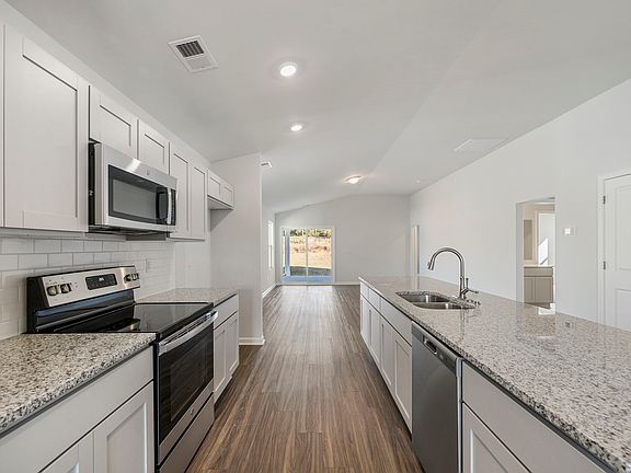 The Brunswick floorplan will surprise you as soon as you see it! The soft gray exterior pairs beautifully with the black shutters and door. As soon as you enter, the rich walnut luxury vinyl plank flooring and the 10 foot ceiling will blow you away in this open-concept home. The huge island, stainless steel appliances, and gray shaker-style cabinets is a great place for the chef in the family to host friends and family. The spacious great room offers a great view to the backyard, showcasing the covered back porch that would be a great spot to relax and enjoy evenings. Both of the secondary bedrooms are spacious and give plenty of closet space. The primary bedroom will become your retreat with the vaulted ceiling and huge walk-in closet. The retreat feel follows you to the bathroom with the tile flooring, five foot shower with glass door, and dual vanities. Come to Regency Walk today to view this amazing home!