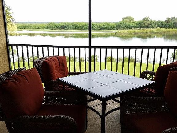 Welcome to the gated resort community of River Strand!!! THIS HAS IT ALL !! The Abbey plan is the largest of the verandas plans. This top floor, end-unit boosts cathedral ceilings and ample natural light. It has two lanai with one overlooking a gorgeous 180 degree view of both water and golf course. A truly beautiful view that has to seen to appreciate. This veranda comes with a full club membership privileges, garage, and is offered TURNKEY FURNISHED! Membership includes a state-of-the-art fitness center, dining at the club house, multiple pools, 8 Har-Tru tennis courts, and 27 holes of golf. Enjoy the maintenance-free life style of resort living -- check out this veranda!
