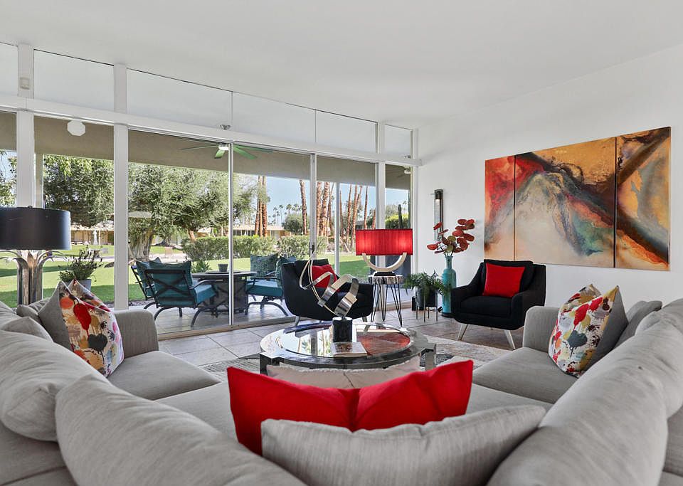 Welcome to Sandpiper Palm Desert, where you can experience the essence of mid-century modern elegance in this stunning 3 bedroom, 2 bathroom remodeled condo situated in the heart of Palm Desert. This home comes beautifully furnished, offering you the opportunity to fully enjoy luxurious living. The large windows flood the space with natural light, providing a view of the expansive covered patio, greenbelt, and community pool. The central courtyard boasts a scenic mountain view, accompanied by redwood lattice work, new plantings, lighting upgrades, and a perfect space for hosting gatherings. The primary bathroom features a renovated tile shower, custom cabinets, and enhanced lighting fixtures for a spa-like feel. The gourmet kitchen, connected to the spacious great room, showcases stainless steel appliances and a new sink. Privacy is ensured with the second primary bedroom located on the opposite side of the home, offering direct access to the pool area and patio. The third bedroom has been transformed into a media room with updated electrical for a TV setup. Both the media room and primary suite have access to the inner courtyard. For convenience, an oversized one-car detached garage is included. Located close to El Paseo shopping and dining, this condo offers a serene setting away from street noise with convenient on-street parking available for your guests.