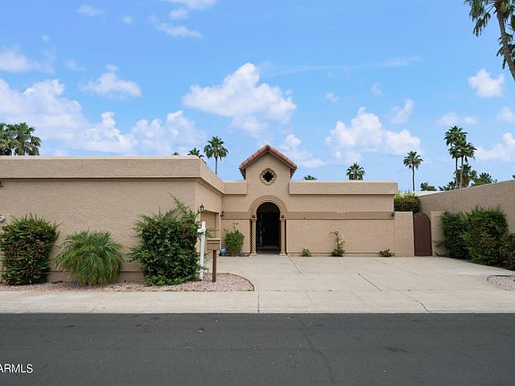 Introducing a stunning 3 bd, 2-1/2 ba home located in the heart of beautiful Scottsdale. This house boasts a spacious floor plan, with plenty of room for entertaining guests or relaxing with loved ones. Upon entering the home, you are greeted with an open and inviting hallway leading to the large living room, complete with large sliding doors that allow natural light to fill the space and open onto the sunny private patio. The kitchen/great room features a new refrigerator and a breakfast bar, making it the perfect spot for entertaining while prepping meals. The split floor plan features a primary bedroom which is a true retreat, with an en-suite bathroom featuring a walk-in tub, a separate shower and a large walk-in closet. The two additional bedrooms also have a Jack 'n Jill bathroom, providing ample privacy and convenience for everyone in the household. One additional half-bath is available for guests. Also included are two beautiful outdoor spaces, perfect for enjoying the sunny Scottsdale weather. The larger patio has turf for easy care and is ideal for hosting barbaques or just lounging in the sun. An additional private patio is located at the rear of the house. New AC Unit and water heater as of 2022. This home was the original model for this sub-division and also features an attached 2-car garage. Located in the coveted neighborhood of Santo Tomas in McCormick Ranch, this home is close to all that Scottsdale has to offer - shopping, dining, entertainment, hiking trails and the nearby McCormick Ranch Golf Course. Don't miss your opportunity to own this gorgeous 3 bedroom, 2-1/2 bathroom home in Scottsdale. This is a Leasehold property. The lease payment is 1/10th of 1% of the sales price.