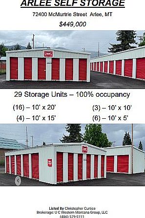 Self Storage complex in the town of Arlee, approximately 30 min North of Missoula. 29 Total units with room for potential expansion. Unit Sizes- 10x20, 10x15, 10x10 & 10x5 Currently 100% Occupancy with all Tenants on Month to Month Rental Agreements and continued inquiries. Lot was graded and overlayed with Compacted Recycled Asphalt in May 2022 Complete Breakdown of Unit Sizes, Current Rents, along with quoted rates available upon request. Call Chris Curtice at 406-579-5111, or your real estate professional.