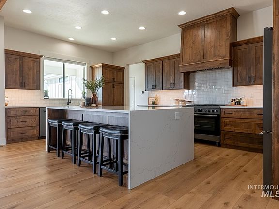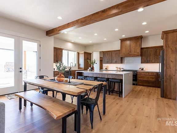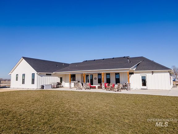 This nearly-new, stunning modern farmhouse combines classic elements with a focus on comfort and livability. The great room boasts soaring beamed ceilings and large windows with a pastoral view, filling the space with natural light. The chef’s kitchen is a highlight with high-end appliances, a large fully-quartz island, and a spacious walk-in pantry. The master suite is a private retreat with a luxurious walk-in, tile shower and walk-in closet. It features a split bedroom floorplan with 4 spacious bedrooms and 3.5 bathrooms, including a second master suite with direct porch access.  Step outside onto the expansive front and back porches, ideal for relaxing or entertaining. With its sleek finishes, open layout, and thoughtful details, this home offers modern living with farmhouse charm.  Bring your animals!  There are no restrictive CCRs or HOAs.  Plenty of room to build a shop, barn, or 2nd home under county guidelines. Located in sought-after Fruitland, this property is move-in ready and waiting for you!