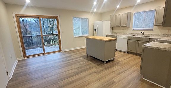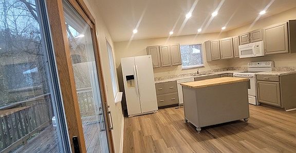 This house is being freshly renovated with new paint, new flooring, new windows, new can lights, new efficient HVAC unit, Floor plan updates include a open Kichen /Great Room living space allowing for a new kitchen island. New can lights and new kitchen island create good light and great workspace.( pictures in process)