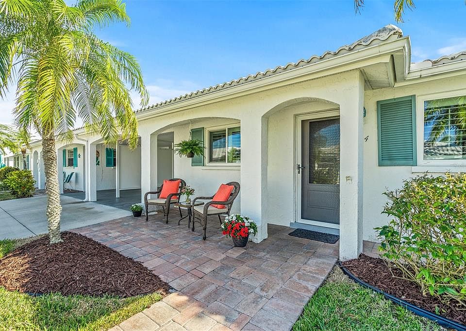 A true value on Longboat Key! Nestled between the Gulf of Mexico and Sarasota Bay, this charming spacious 2-bedroom, 2-bath 1,353-square-foot villa is a great buy. The tastefully updated maintenance-free property has a newer kitchen in 2020 with modernized cabinets, Corian counters, upscale lighting, undermount sink, tile floors and more. The bathrooms have been fully renovated with neutral chic selections. There are two separate Florida rooms that allow for an office, quiet sitting room or extra sleeping space when needed, a true flex room with plantation doors for privacy. Roof is 2007, AC 2018 and water heater 2021. Windows are all hurricane rated and the engineered flooring is beautiful throughout the living area with tile in the kitchen and bathrooms. The master has plantation doors as well as the hallway to allow privacy for guests. A back patio and front porch allow for outdoor enjoyment. Grills are allowed plus there is additional storage and room for an outdoor shower. In addition, there is a 1-car carport, laundry room and storage space. This is an immaculately maintained boating community with a private, deep-water marina, holding up to 40' vessels. First-come, first-serve, extremely affordable with slips available with water and electric at the renovated Trex docks. Enjoy incredible sea life with dolphins, manatees, and surrounding bird sanctuaries, plus kayaking, boating, golfing and fishing are favorite past-times. It's just a few minutes stroll to the deeded beach access. Pet-friendly community that lives like a neighborhood with many activities, heated pool and community center. You can purchase at any age. Ask for details. Come enjoy living what feels like a single-family home where you can enjoy gardening, grilling with fit classes, card games, fish frys, pickleball and tennis with neighbors and continual friendly get-togethers.