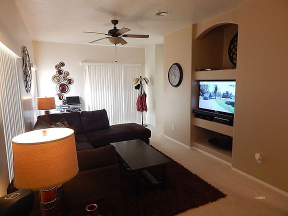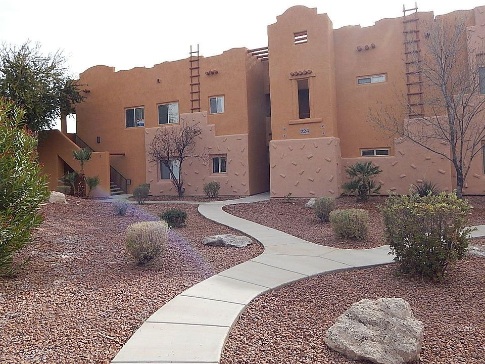 Mesquite's highly regarded condominium development--Enchantment. Purchase in Mesquite at an affordable price. All appliances included. The heat pump was replaced in 2017 and was professionally painted around that time. Located in the NE corner of the development, you won't face the typical dilemma of many condo owners--finding extra parking close to your unit. You'll see in the pictures that you will not have that problem. As an owner in Enchantment, you will enjoy not only the onsite pool and hot tub, but you will have membership in the Mesquite Vistas Sports Club. This country club type facility features a large outdoor pool and spa, pickleball and tennis courts, horseshoe pit, workout room, and a small kitchen that serves sandwiches, sodas and adult beverages to enjoy poolside.